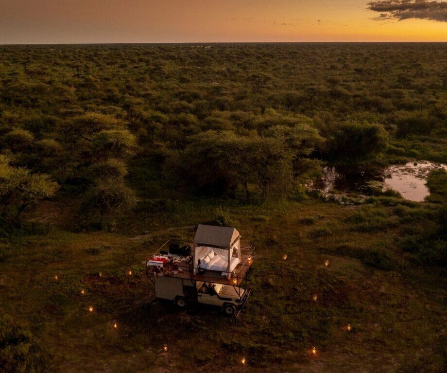 Couples with a spirit of adventure will absolutely love to spend one of their nights on Onguma’s one-of-a-kind Dream Cruiser in the middle of the wilderness, under a canopy of stars. A land cruiser has been custom-converted into a star bed – complete with creature comforts like a flushing loo with a view and basin and shower below leading up, by internal ladder, to a beautiful upper deck with lounge and dining area and a lush four poster bed draped in netting! Enjoy a delicious picnic-style dinner and bubbly under the stars before tucking up in bed. Couples can choose to close the canvas flaps if they wish – or enjoy sweeping 180-degree views over a waterhole all through the night, with that added injection of adrenaline! (Spoor showed that a lion walked right past me to drink water on the night I spent on it, but I sadly slept through the whole thing!)