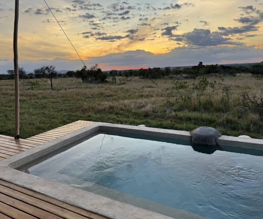 Suites are furnished with a sumptuous king-size bed, freestanding bathtub with a view, cosy fireplace in the lounge, both an indoor and outdoor shower under the stars and beautiful deck that opens straight out to sweeping savannah views, perfect for sunset bubbles or stargazing. These suites also boast the only heated private plunge pools in the Serengeti, I am told!