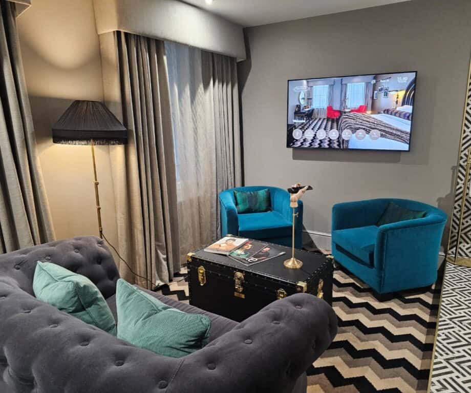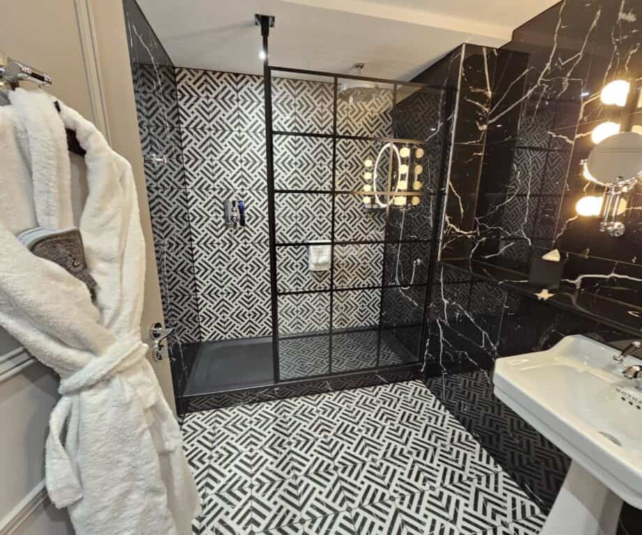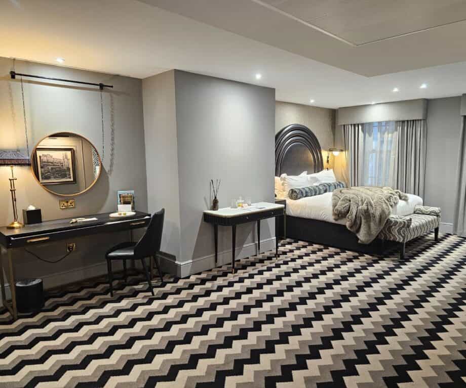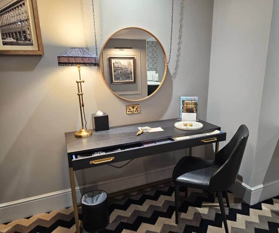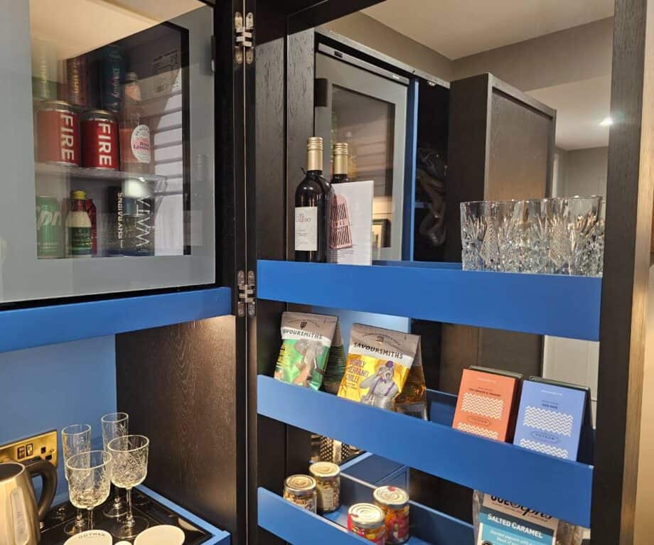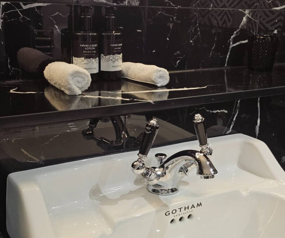 The suite’s built-in wardrobe cleverly conceals a well-stocked minibar (including local ‘Fire’ beer and complimentary Geordie “wata”), alongside a kettle with premium teas, coffee and hot chocolate, plus a selection of snacks available for purchase. Practical yet thoughtful extras like a safety deposit box, hairdryer and curated reading materials — from the hotel’s own Gotham Bugle to high-end magazines — round out the experience.