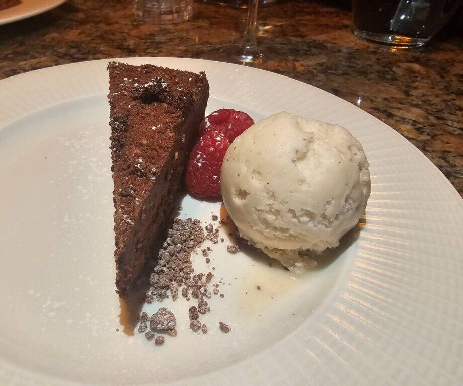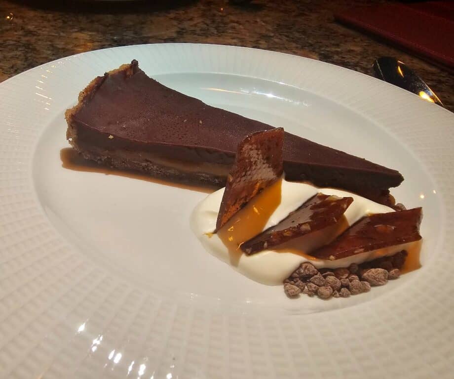 We both indulged in the two chocolate options on the dessert menu – the chocolate and caramel tart with crème fraîche and praline, and the decadent chocolate and truffle brownie torte.