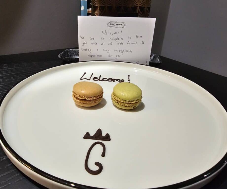 Attention to detail is where Hotel Gotham truly shines. Upon arrival we found a personalised welcome note resting beside a Gotham plate adorned with macaroons and a jar of hand-crafted shortbread — golden, buttery and playfully inspired by the city’s firefighting heritage.