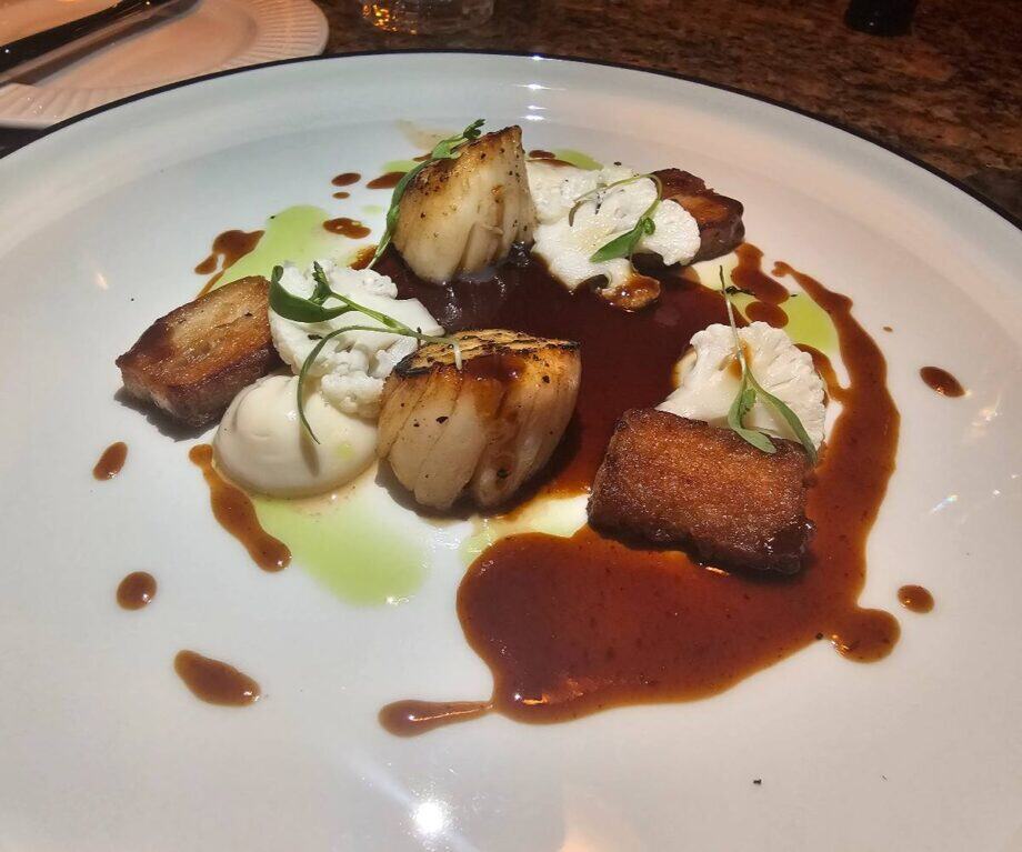 The pan-roasted scallop with pork belly, cauliflower and Lindisfarne mead narrowly got my vote over the Craster smoked fish terrine with horseradish, cucumber and dill, whilst my wife’s burrata with Waldorf salad and Arbequina olive oil won her approval.