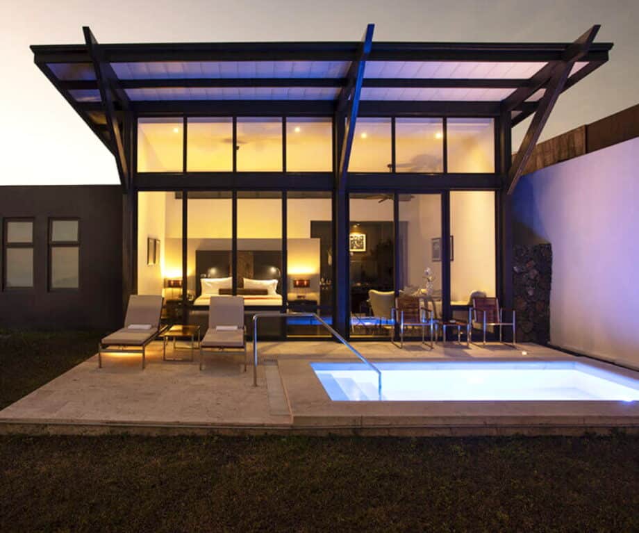 The lodge has adopted a contemporary architectural design that expresses horizontal lines through steel and glass softened by pale wood and volcanic stone as its building materials. The separation between interior spaces and outdoor areas is achieved by the lodge’s floor-to-ceiling windows, which create an uninterrupted view of the Galapagos highlands and Pacific Ocean.