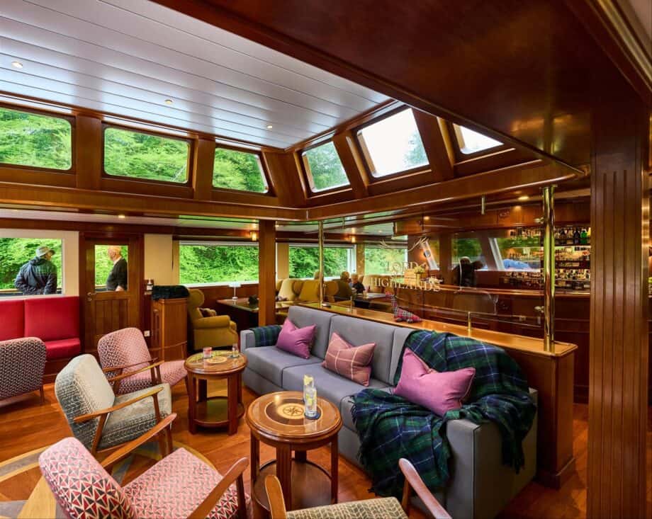 Dark wood, plush carpets and flashes of tartan give a country house feel to the 19-cabin Lord of the Highlands. It’s a ship with royal associations too: Queen Elizabeth ll twice hired sister-ship Hebridean Princess to host her guests.