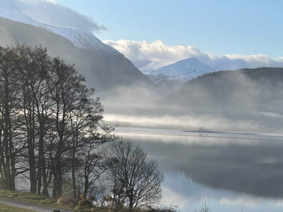 Snow-covered hills frame first Loch Lochy and then onto the canal that links to Loch Oich. The canal was partly a social project to provide labour for men cleared from the Highlands – paid with beer, coins and whisky – provided they supplied their own spade.