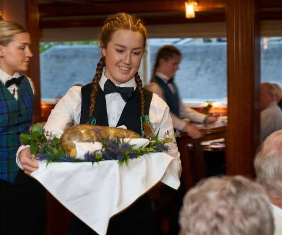 Bagpipes welcome the haggis and a splendidly kilted seaman reads Rabbie Burns’ address to the haggis. The waitresses serve whisky with the haggis.