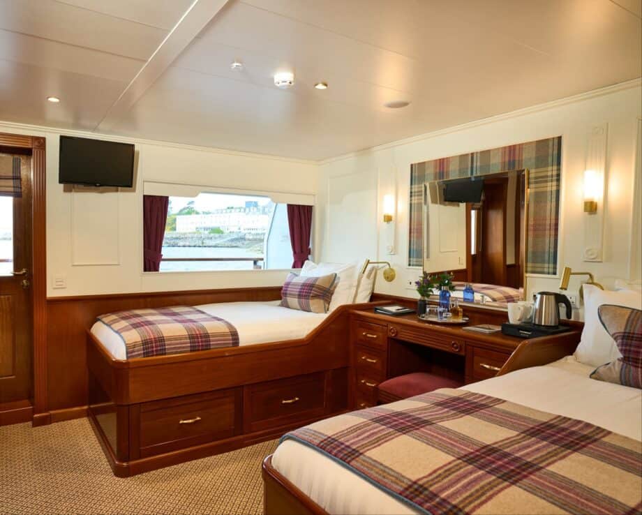 Breakfast, lunch, dinner and drinks are all part of the all-inclusive package which features a variety of 26 single-malt whiskies behind the bar. Stepping ashore, admissions to attractions such as Duart Castle, Mull Cheese Farm, Glenfinnan Monument and the Culloden Visitor Centre are covered, as are tea, coffee and cakes at the cafes.