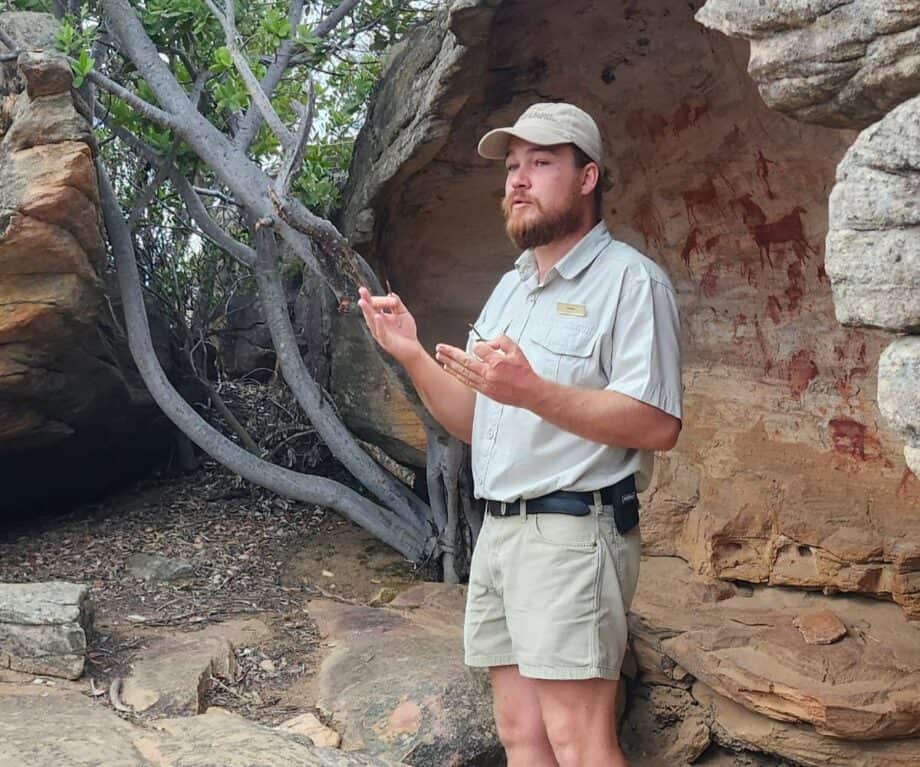 “The San believed that what you painted on these walls would be visible in the spiritual world as well,” he went on, pointing to a figure painted next to a natural hole in the rock. “If white walls acted as a window or a veil, a little hole like this one would be a passageway to the world beyond, so the figure close beside it would most likely be a shaman, perhaps in a trance state.”