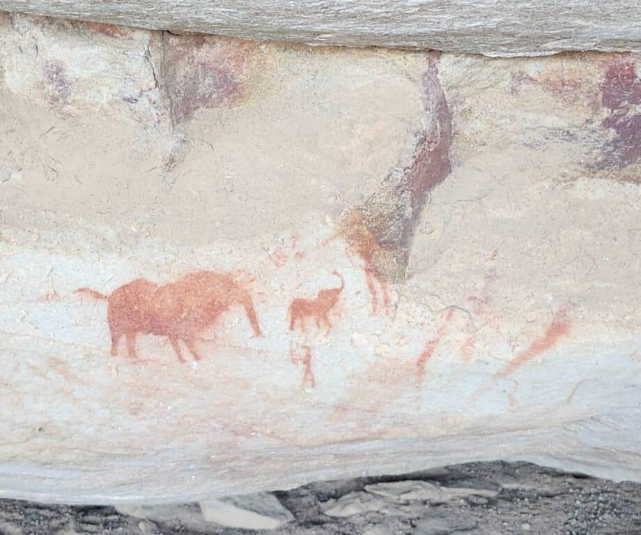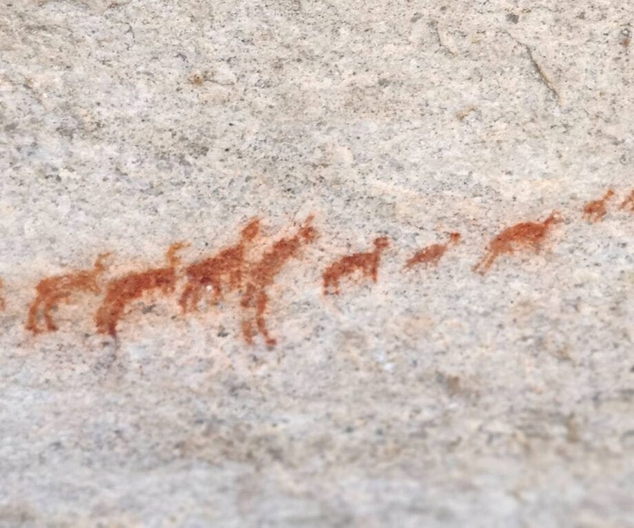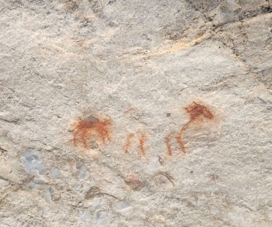 He pointed to an example of a probable sheep. “Another group that inhabited this region, the Khoi, were sheepherders, and it’s possible they raised a black-headed breed that’s very popular in this area. I grew up on a farm, so when I look at this drawing, it immediately says sheep to me. It has the same-shaped head, a bit of a neck, and what would have been a white body. Next to it looks like a newborn lamb—its legs are way too long for these small little bodies.”